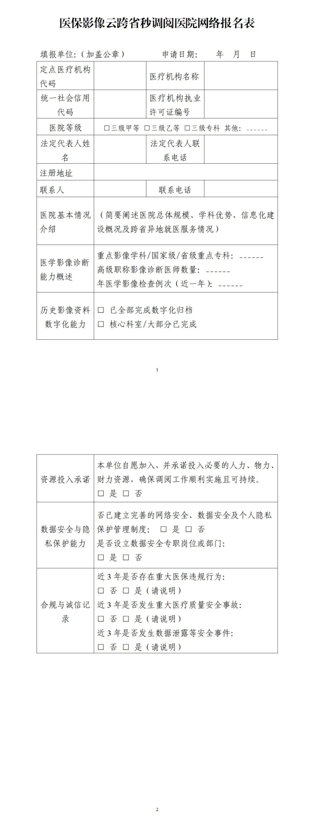 已具备历史影像资料数字化能力,自愿加入医保影像云跨省秒调阅网络,承诺投入必要的人力、物力、财力资源,确保调阅工作顺利实施且可持续。具备完善的数据安全管理制度和技术防护能力,可保障影像资料及参保人隐私安全。严格遵守医保法律法规、医疗质量管理规范及数据安全相关规定,近3年无重大医保违规、医疗质量安全事故及数据泄露等不良记录。