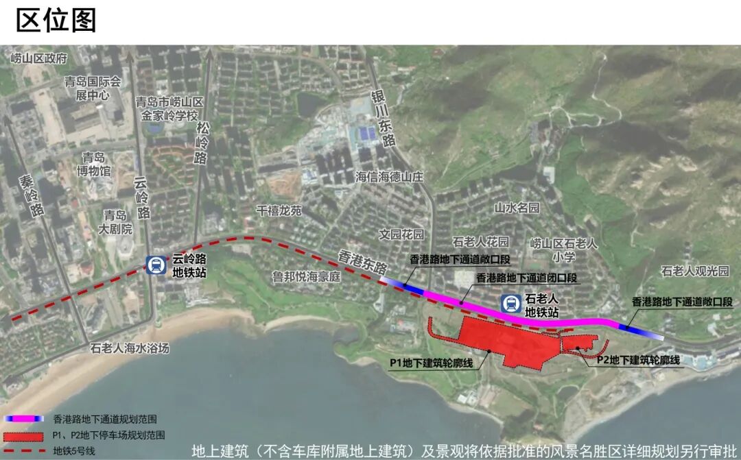 10月12日,青岛市自然资源和规划局在其官方网站发布了《地铁5号线延伸段工程(云岭路站—石老人站)及崂山区滨海区域基础设施配套工程(P1、P2地下停车场、香港路地下通道工程)规划及建筑方案批前公示》。